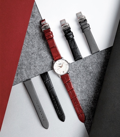 在工作场合时可以选择佩戴黑色半哑光小牛皮表带,出去约会逛街的时候,再分场合选择佩戴灰色缎面或红色漆皮表带。一块女士腕表真的是轻松解决日常生活中遇到的所有场景,感觉就像拥有3块不同的腕表一样!
