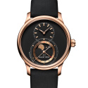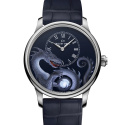 腕表搭载三问报时功能,令华丽的自动玩偶装置随着音律展开活动。此功能通过雅克德罗RMA89机芯内安装的教堂钟声音簧,可根据需要报响小时、刻钟和分钟,此机芯通过卡锁启动,并配备浮动式调校机构,借助外部细小簧片的摩擦调控三问报时,因而几乎静默无声。此复杂功能的创新之处还包括采用全新齿条,刻钟和分钟之间的停顿时间延长以及以大三度鸣报刻钟。空灵玄妙的音律和瑰美雀羽尽展雅克德罗独特的艺术理念。