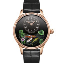 这款匠心独具的热带风情报时鸟三问表呈现苍翠繁茂的自然景象,近景处一只绿孔雀悠然独立,悠然开合尾屏。此百鸟之王见诸于中国众多神话传说与经典诗画之中,象征着德行操守、道义公正、慈怀仁善。远景处一只蜂鸟在瀑布前跃跃欲动,其翅膀每秒钟可扇动四十次,模拟自然界中的真实蜂鸟飞行状态。巨嘴鸟、蜻蜓等活动元素亦赋予动态场景栩栩逼真感。
